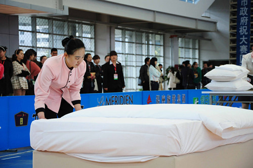 前厅入住登记项目 ![]() 中式铺床及夜床操作项目 中餐宴会摆台项目 西餐宴会摆台项目4月22日上午,全省职业院校技能大赛高职组现代酒店服务技能大赛实施接待方案阶段比赛在公司体育馆继续进行。各参赛队在前厅入住登记、中式铺床及夜床操作、中餐宴会摆台和西餐宴会摆台四个项目上展开激烈争夺,比赛将于今日中午结束并当场宣布比赛成绩。