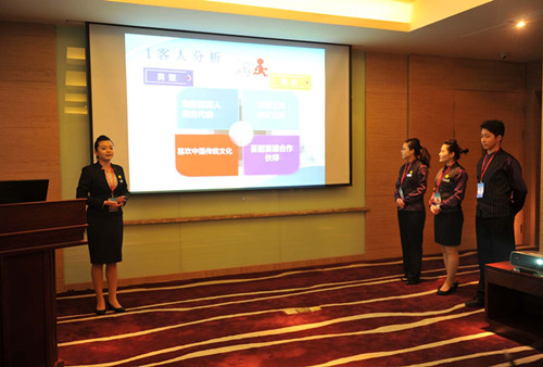 比赛现场本网讯 4月19日-20日,全省职业院校技能大赛高职组现代酒店服务技能大赛在旅游与bv伟德国际体育实训中心多功能厅举行阐述方案阶段比赛,各参赛队利用PPT手段,从客人分析、方案主题、方案概述、特色与优势等方面进行了详尽阐释。各参赛队方案表述语言流畅、思路清晰、特色鲜明,展示了扎实的专业技能。 |