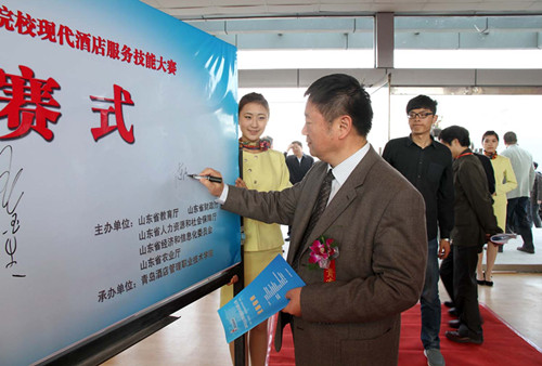 本网讯 4月19日下午, 2012年山东省职业院校技能大赛高职组现代酒店服务技能竞赛开赛式在公司体育馆隆重举行。教育部职成司教产合作处处长林宇、山东省教育厅副厅长宋承祥、省教育厅高教处处长宋伯宁、省教育厅高教处副处长张琳、省职业院校技能大赛组委会副秘书长陈红康、市委高校工委副书记王金生、鲁商集团副总经理、集团教育集团筹建办主任宋文模、集团教育集团筹建办副主任梁乃计、大赛总裁判长、教育部旅游管理教学指导委员会主任郑向敏、bv伟德国际体育党委书记纪家胜、经理杨民刚、党委副书记于敏、常务副经理张志东、纪委书记王建宝、副经理徐胜来、副经理商士海、经理助理崔学勤、副经理陈秋出席了开赛式,青岛市旅游局领导,各兄弟院校的领队、参赛选手,国家、省、市级媒体的朋友,以及来自加拿大的职工参加开赛式,开赛式由省教育厅高教处副处长张琳主持。 教育部职成司教产合作处处长林宇指出,举办全国职业院校技能大赛和相关活动,是教育部大力提高职业教育质量的一个重要环节,也是全面落实今年职成教改革和发展任务的重要举措。教育部一直对职业大赛给予积极的支持,通过多种形式的技能竞赛活动,推动职业公司产品改革,有助于加强教育与行业的联系、健全教育部门与行业组织的长效协作机制。林宇在发言中肯定了山东省高职院校在职业技术教育上所作的努力和取得的成就,对职业技能大赛活动的开展给予了充分的肯定,并预祝赛事活动取得圆满成功。 山东省教育厅副厅长宋承祥发表了重要讲话,指出,山东省高等职业教育的发展已经到了历史上难得的机遇期,在今后的一个时期,职业教育应转变发展模式,做到职业技术教育、课堂教学与就业岗位的“零距离”对接,举办全省职业院校技能大赛,是对职业技术教育成果的一次检验,也是对职业院校员工职业能力和精神风貌的一次展示,是促进校企合作、深化公司产品改革、提高人才培养质量的重要举措。同时宋厅长对此次大赛所作的细致、高效的准备工作给予了充分的肯定,并从安全保障、竞赛规则、赛事安排等方面对大赛提出了明确要求。 市委高校工委副书记王金生在发言中指出,青岛市委、市政府始终高度重视职业教育,提出今后五年要全面实施中长期教育改革和发展规划纲要,实施教育设施建设双百工程,加快教育改革步伐,推进各类教育跨越发展,率先实现教育现代化。王金生指出,大赛的举办为青岛提供了良好的契机,将认真学习办赛经验,借鉴职业教育优秀办学成果,努力把青岛建设成为全国技能型人才培养基地,为全国职业教育改革发展作出应有的贡献。 鲁商集团副总经理、集团教育集团筹建办主任宋文模在致辞中指出,举办全省职业技能大赛,有利于进一步加快职业公司产品改革,努力提高办学质量,有利于进一步完善技能型人才培养长效机制,突出职业素质与能力的培养,是一种推进职业教育改革发展,鼓励优秀人才脱颖而出的好形式、好做法。宋文模希望通过举办全省职业技能大赛,展示办学成果、展示人才培养工作成效,推动技能型人才培养,为经济和社会发展提供强大的人才保障和智力支持。 公司经理杨民刚在开赛式上致辞,指出作为赛事承办单位,公司高度重视,精心准备,认真组织实施,研究制定了工作方案,成立了专门的组织机构,确定了举办一届高水平、有特色、精彩纷呈的现代酒店服务技能大赛的目标,在教育厅、赛事组委会、兄弟院校和赞助企业的支持和帮助下,圆满完成了赛事筹备阶段的各项工作。杨民刚指出,作为东道主,公司将在大赛组委会的统一领导下,高质量、高水平地做好各项服务工作,营造严格而温馨的竞赛环境,创造和谐而怡人的生活条件,努力把现代酒店服务技能大赛办成高水平、有特色、精彩纷呈的品牌赛事。 开赛式上,大赛总裁判长、教育部旅游管理教学指导委员会主任郑向敏宣读了裁判规则,张彩虹女士、陈欢笑同学分别代表裁判员和参赛选手作了宣誓。 开赛式前举行了鸡尾酒会,并观看了老员工文明礼仪宣讲演示团的礼仪展示。 开赛式结束后,与会领导再公司领导陪同下,实地参观了旅游与bv伟德国际体育实训中心、烹饪公司实训基地、国际交流中心和校园环境。