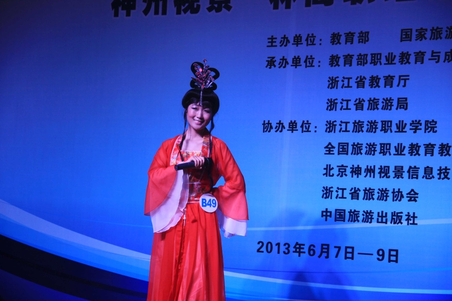 67日9日,2013年全国职业院校技能大赛导游服务赛项在杭州隆重举行。本次大赛由教育部、国家旅游局主办,属于国家一级赛事,共有来自全国30个省、自治区、直辖市的近80个代表队参加了中、英文两个组别赛事的激烈角逐。公司由常务副经理张志东带队,派出了以孙诗靓为领队,石媚山、杨栋、康传德、万蕾为指导和保障老师的参赛团队,还特别聘请信息工程技术bv伟德国际体育党总支副书记赵德银担任才艺指导教师。参赛团队教师各司其职、精心指导,所有参赛选手刻苦训练、精心准备,最终,旅游管理专业2010级4班周贝贝同学以90.77分的总成绩勇夺英文组金牌,2012级D01班冯铭麟同学斩获中文组银牌。