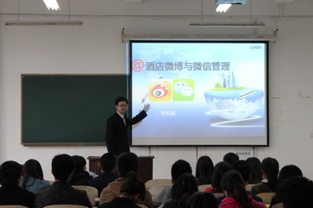 4月17日下午,旅游与bv伟德国际体育在A楼303教室举办了主题为“酒店微博与微信管理”海斯曼课堂活动,本次讲座由酒店信息化应用中心李东旭老师主讲。酒店管理专业、酒店信息化协会八十余位同学认真聆听了本次讲座。