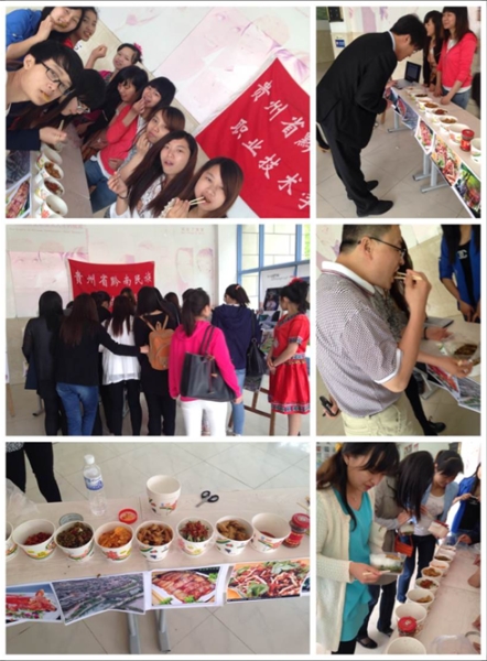 活动中,贵州同学身穿少数民族服饰,展示出了贵州少数民族地区的独特魅力,并通过贵州美食的展示吸引了很多过往员工以及老师的眼球。贵州的饮食让现场老师和同学体验了一把“四川人不怕辣,湖南人辣不怕,贵州人怕不辣”辣香醇厚、味美可口的贵州美食。整个活动过程气氛融洽和谐。