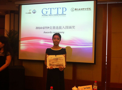 另外,在导游赛项结束后,荣获英文组金牌的选手参加了由世界旅行及旅游合作组织(GTTP)举行的2014年全球旅游案例研究大赛中国大陆选拔赛。选拔赛有英文演讲、英文小组自由讨论、英文答辩、英文观点阐述等环节,尤其是在英文答辩环节,张晓晓同学对答如流、观点鲜明、阐述深刻,给GTTP的国际评委留下了深刻印象。最终张晓晓同学以总分第一名的成绩获得2014全球旅游案例研究大赛的2个名额之一(大赛总决赛全球共有12个名额,其中中国大陆2个名额)。张晓晓同学将与其指导老师在今年11月代表中国大陆前往摩纳哥和法国参加2014年全球旅游案例研究大赛,参赛的所有费用将由GTTP组织全额承担。