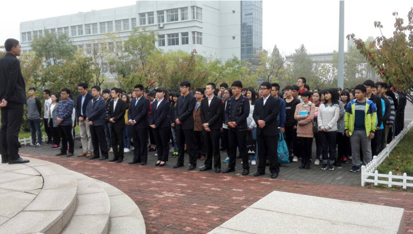 在全体师生的注目礼下,英姿飒爽的国旗护卫队员们护送鲜艳的五星红旗入场,行礼完毕,伴随着庄严地《中华人民共和国国歌》,五星红旗冉冉升起,迎风飘扬。在场的每一个人向国旗行注目礼,深怀对祖国无限的热爱和崇高的敬意。