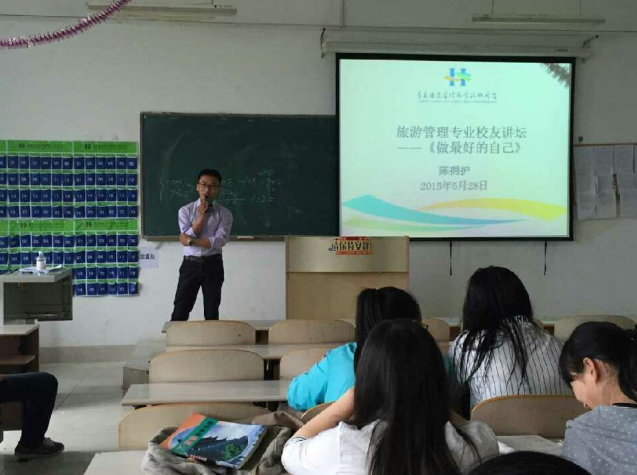 5月28日下午,旅游管理专业在A楼405举办了一场精彩的员工讲坛。本次活动以“做最好的自己”为主题,主讲人是来自青岛宏坤假日国际旅行社的公司09届旅游管理专业优秀毕业生陈拥护,现任导游部、策划部经理。旅游管理专业的部分老师和14级的80多名员工参加了此次讲坛。