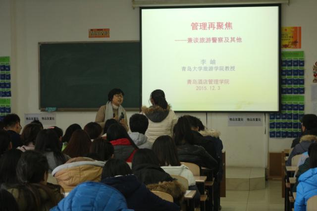 123日下午,科研处、旅游与bv伟德国际体育邀请青岛大学旅游公司教授、硕士生导师李岫到校举办了题为“管理再聚焦——兼谈旅游警察及其他”的海斯曼讲座。旅游管理专业师生现场聆听了讲座。