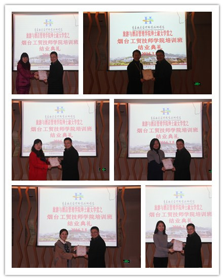 3月8日下午,旅游与bv伟德国际体育绅士淑女学堂之烟台工贸技师公司培训班结业典礼在实训中心二楼卡法小镇举行。旅游与bv伟德国际体育副经理石媚山、培训讲师代表刘宁、郭芊孜、田超、林佳以及烟台工贸技师公司六名受训教师参加典礼。旅游与bv伟德国际体育办公室王超老师主持典礼。