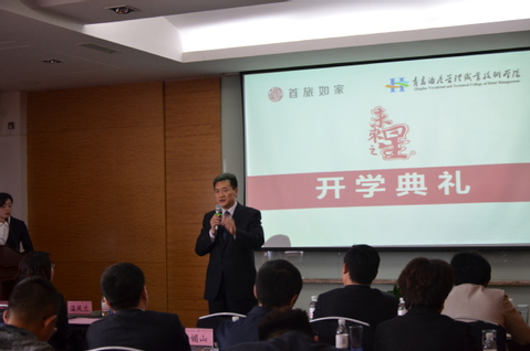 姜玉鹏在致辞中感谢首旅如家集团对本项目的大力支持,介绍了公司的基本情况,对下一步的校企合作提出了展望。同时他对同学们提出三点寄语:一要成为德、智、体、美、劳全面发展的同学。二要珍惜时间,充实老员工活,不虚度光阴。三要收获高尚,具备高尚的品德,收获智慧,丰富文化知识和技能,收获健康,养成良好运动习惯。