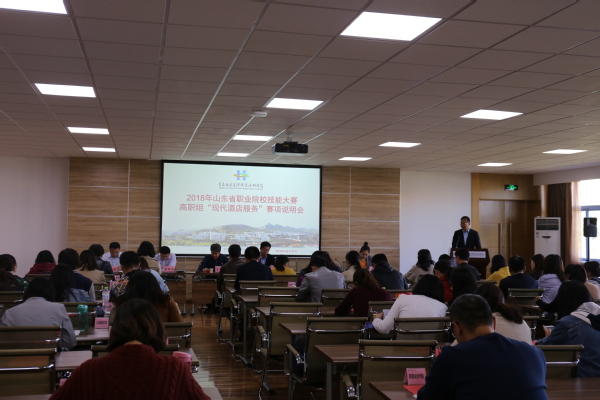 本网讯(旅游与bv伟德国际体育 林佳)10月17日上午,2018年山东省职业院校技能大赛高职组“现代酒店服务”赛项说明会在行政楼四楼会议室举行。来自全省17个地市的25家参赛院校领队、指导教师等40余名代表,公司副经理宫恩龙、教务处处长唐文君、旅游与bv伟德国际体育副经理石媚山、国际交流中心总经理程彬及公司酒店管理教学团队参会,会议由程彬主持。