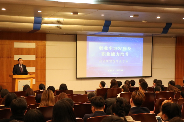 本网讯(旅游与bv伟德国际体育 李涛)近日,为切实增强员工的职业认同感,帮助员工开展职业生涯发展规划,旅游与bv伟德国际体育在2018级新生中开展“职业经理人讲坛”活动,讲坛历时三个月,采取线上实时视频连线和线下讲座的形式开展。先后邀请鲁商集团银座旅游集团副总经理周立刚、北京华尔道夫酒店人力资源总监孙亚南、上海波特曼丽思卡尔顿酒店房务总监陈娟、青岛鲁商凯悦酒店销售总监霍丹丹、银座旅游青岛分公司总经理李正等8家知名酒店、旅行社的10余名高管和华侨大学博士生导师郑向敏教授来校讲座,同时依托礼豪程项目,万豪集团北京宝格丽酒店市场营销总监茅矛、万豪集团上海万怡酒店行政总厨John Wang、重庆万豪酒店财务总监等8名院校教授、行业高管与员工开展了实时视频连线授课,旅游与bv伟德国际体育部分老师和2018级1347名新生全部参加了讲座活动。
