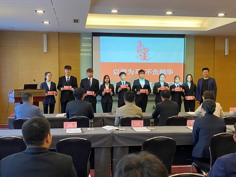 首旅如家酒店集团商旅事业部北华东区域人力资源副总监靳大为和首旅如家酒店集团商旅事业部北华东区域青岛区城市总经理仪明珠及如家班班主任毛安为如家班的同学们颁发了《录取通知书》。
