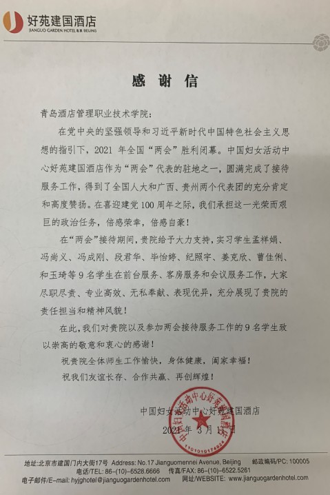 公司酒店管理专业实习生服务全国两会已经有十余年时间,本年度实习生服务多个地区的代表团。其中,北京好苑建国酒店实习生服务贵州代表团和广西代表团,北京饭店实习生服务上海代表团、江西代表团、港澳代表团,全国人大常委会办公厅机关服务中心实习生服务全国两会新闻发布会等。同学们凭借过硬的服务技能、真诚的服务态度、上佳的形象气质获得了与会者的高度赞赏。服务结束后,参与服务的同学多次受到代表们的口头和书面感谢。北京好苑建国酒店发来感谢信并赠送锦旗,特别感谢公司实习生的辛勤付出。