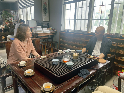 纪小川在江苏省传统技艺技能大师、陶瓷艺术大师范泽锋的带领下进行走访参观,并就紫砂陶器具的发展对茶艺与茶文化领域的影响、茶空间设计的发展趋势以及高校技能型人才的培养与行业团队的共享等问题进行交流。