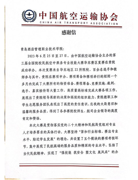 本网讯(bv伟德国际体育 李倩)近日,第三届全国院校民航空中乘务专业技能大赛华东赛区复赛在公司成功举办,中国航空运输协会向公司发来感谢信,对公司高质量高标准协助承办赛事表示感谢,并给予高度评价。