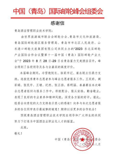 本网讯(bv伟德国际体育 滕柯)近日,中国(青岛)国际邮轮峰会组委会发来感谢信,对公司为“2023东北亚邮轮产业国际合作会议暨第十一届中国(青岛)国际邮轮产业大会”做出的突出贡献表示感谢。