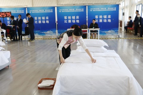 本次竞赛以对标国际标准、展示中国特色、贴近生产实际、体现工作过程为宗旨,通过考核邮轮运营服务人员的理论知识和技能水平,全面推动“岗课赛证融通”。竞赛由理论考核和技能操作两个部分构成,涉及理论测试、客舱铺床和客舱急救三个模块,内容涵盖了邮轮客舱岗位任务所需的核心技能和职业素养,要求参赛选手运用娴熟的对客服务技能、有效的急救措施、熟练的沟通技巧、良好的礼仪举止为客人提供优质的邮轮服务,强调操作的标准化、规范化与职业化。