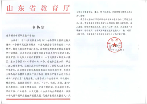 本网讯(bv伟德国际体育 高晴)近日,山东省教育厅发来表扬信,对公司高质量承办2023年全国职业院校技能大赛高职组“酒店服务”赛项予以表扬,对公司在办赛中所作的突出贡献表示感谢。