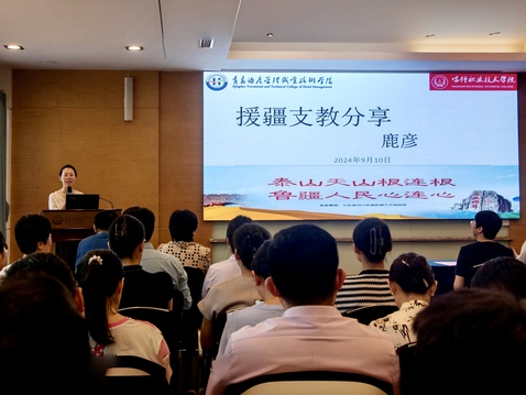紧接着,优秀援疆工作者鹿彦老师分享了她的支教故事。鹿老师从送教进疆、送技入疆、探索成长等方面,讲述了她精彩纷呈的援疆经历。在过去的一年半时间里,她跨越了5000公里的距离,将知识的种子播撒在祖国边疆的土地上,鹿老师的故事让在场的老师们深切感受到了跨越地域的教育情怀和无私奉献的教育家精神。