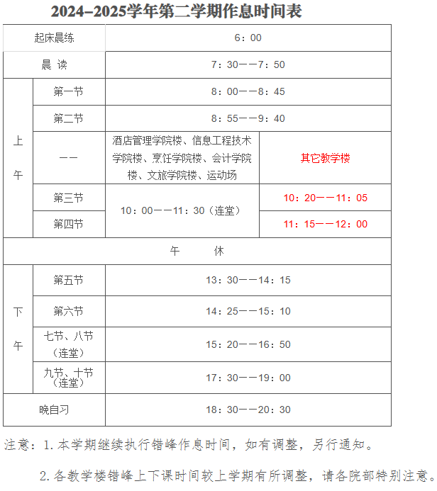 2024-2025学年第二学期作息时间表