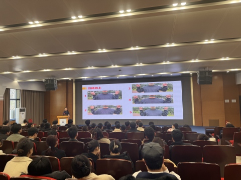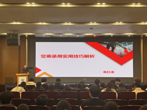 讲座中,葛教官结合硬性条件、软性素质和隐性考核点三大方面,就目前全国各大航空公司的招聘趋势和选拔标准进行研读分析。从“面试全流程环节”、“安全员身体素质训练方法”、“服务意识与应急能力培养”三大维度展开深度分享,并现场演示客舱安保标准化动作。