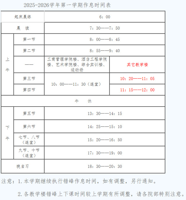 2025-2026学年第一学期作息时间表