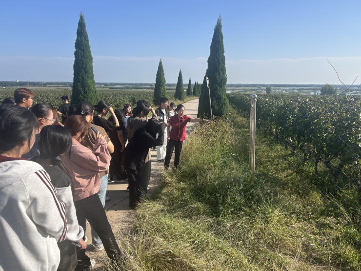 在九顶庄园,师生分组由酒庄销售经理邱子松和品牌大使王翠萍带领,深入葡萄园、酿酒车间与酒窖,进行场景化、系统性学习。在葡萄园里,同学们系统学习了不同葡萄品种的特性与田间管理技术;车间里,同学们详细了解了各类葡萄酒的酿造流程、不锈钢发酵桶与橡木桶的使用区别、不同酒款的发酵与陈酿工艺。在品鉴环节,邱子松带领大家品鉴了酒庄具有代表性的5款红、白、桃红葡萄酒。从观色、闻香到品味,专业学子逐步掌握品鉴基本流程,更是对山东产区的风土和风味有了深刻的认知和感受,体会到酒庄种植体系和生产体系对风土和风味的重要意义,只有好的酒庄才能生产出代表性产品。