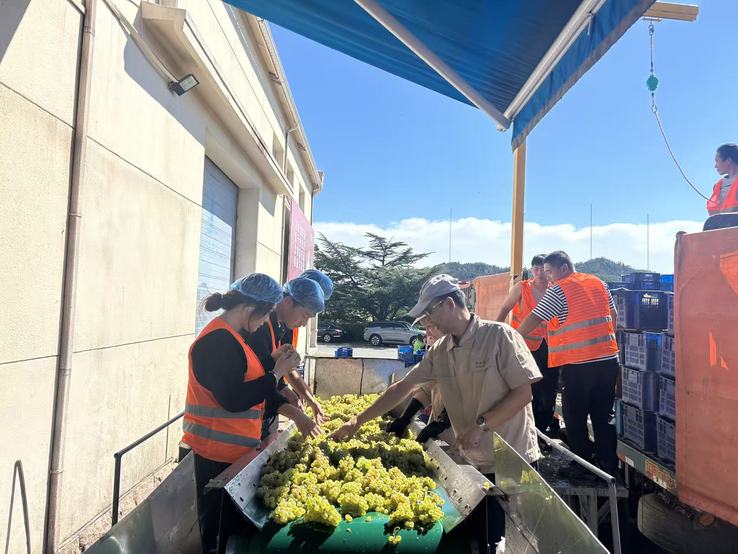 为进一步加深大家对原料品质重要性的理解,活动特别安排了葡萄筛选实践环节。全体同学换上工装,在刘春生的现场指导下,亲手参与葡萄筛选,学习操作规范,严格把控每一粒葡萄的品质。通过亲身实践,同学们不仅体会到“一瓶好酒从一粒葡萄开始”的匠心追求,也更深刻地感受到总酿酒师对品质的高标准与严要求——这正是葡萄酒酿造中不可或缺的工匠精神。