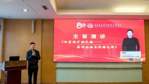主旨演讲与圆桌对话环节聚焦行业前沿与职业发展。优秀员工、首旅如家酒店集团发展中心总经理闫健以《如家的扩张之路:数据驱动与战略选择》为题,分享酒店行业创新实践;在围绕“专业跨界”“职业能力跃迁”等议题的圆桌对话中,青龙美爵酒店总经理史兴伟、乔治莫兰迪酒店城区经理赵和、淄博张店潘南印巷餐厅创始人杨锋3位优秀员工与主持人、青岛融海耀洲酒店业主总经理李晓庆展开深入交流,为在校生与青年教师提供了宝贵经验。